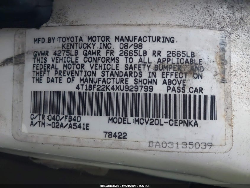 4T1BF22K4XU929799
